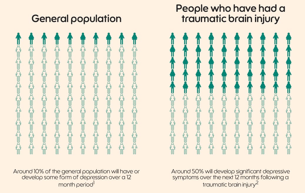 It has been estimated in many studies around the world that around 50% of people could develop depression after they have had a traumatic brain injury over the next 12 months.